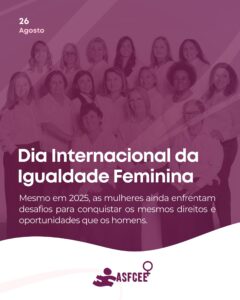 #Descriçãodaimagem: A arte mostra um fundo em tom roxo e filtro sobre a imagem das diretoras da ASFCEE, todas vestidas de branco, em posição de destaque e união. No canto superior esquerdo, lê-se “26 de agosto”. Ao centro, o título em letras brancas: “Dia Internacional da Igualdade Feminina”. Logo abaixo, um texto reforça que, mesmo em 2025, as mulheres ainda enfrentam desafios para alcançar os mesmos direitos e oportunidades que os homens. Na parte inferior, aparece o logotipo da ASFCEE com o símbolo feminino incorporado.