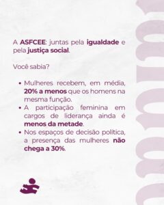 Por isso, hoje, a ASFCEE reafirma seu compromisso com cada mulher que luta por dignidade, por espaço, por respeito. Não basta apenas reconhecer, é preciso agir, apoiar, incluir. Que nenhuma mulher precise lutar sozinha.