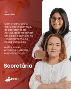 #DescricaodeImagem: Card institucional em tons de vermelho e branco. À esquerda, há o texto de homenagem ao Dia da Secretária, com destaque para a data “30 de Setembro”. No fundo, uma imagem com teclado, mãos femininas e caderno. À direita, duas mulheres aparecem: uma mais jovem, de óculos, sorridente e de braços cruzados ao fundo; e uma mulher mais velha à frente, com expressão serena e postura confiante. Ao final, lê-se: “Dia da Secretária” e o logotipo da ASFCEE.