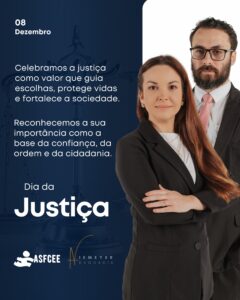 #DescriçãoDeImagem: A imagem tem fundo dividido entre azul-escuro, à esquerda, e branco, à direita. No lado azul, aparecem os textos: “08 Dezembro”, seguido das frases “Celebramos a justiça como valor que guia escolhas, protege vidas e fortalece a sociedade.” e “Reconhecemos a sua importância como a base da confiança, da ordem e da cidadania.”, na cor branca. Logo abaixo, está escrito “Dia da Justiça” em destaque, também em branco. Ao fundo, há a silhueta discreta de uma balança da justiça. No canto inferior esquerdo, estão os logos da ASFCEE e da Niemeyer Advocacia. No lado direito da imagem, estão os advogados da entidade, ambas com expressão séria e postura formal. O conjunto visual reforça sobriedade, institucionalidade e referência ao tema da justiça.