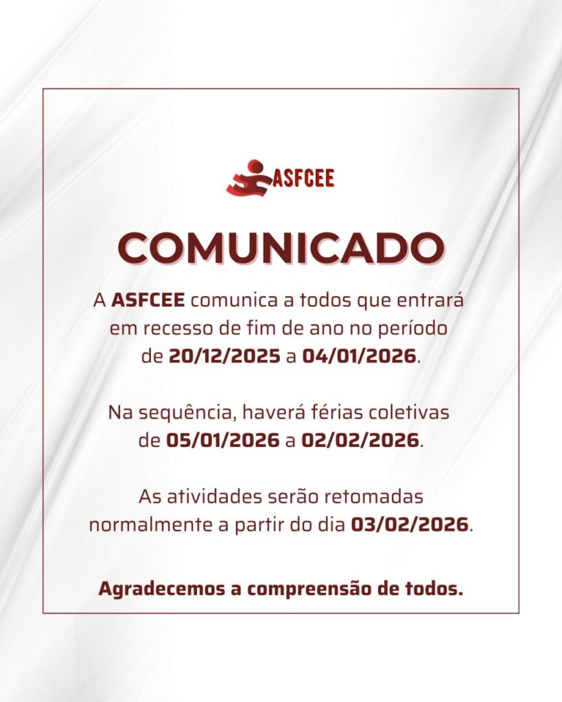 A ASFCEE comunica a todos que entrará em recesso de fim de ano no período de 20/12/2025 a 04/01/2026.