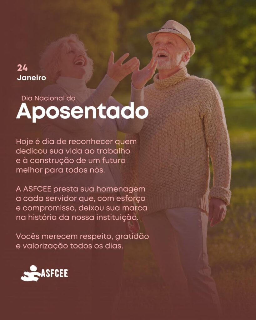 #DescriçãodaImagem: foto de um casal de idosos sorrindo ao ar livre, em um cenário de parque com árvores. Sobreposição translúcida marrom-avermelhada na lateral esquerda contendo o texto. Título grande “Aposentado”, data “24 Janeiro” e parágrafos em português homenageando servidores aposentados. Logo e nome da instituição “ASFCEE” posicionados no rodapé.